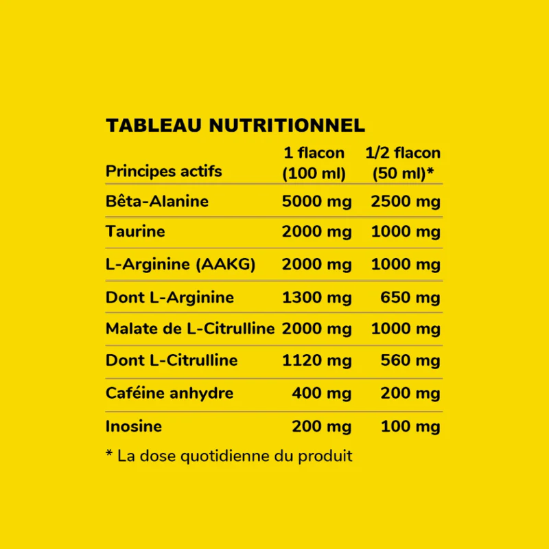 Dose très élevée en caféine : 400 mg par flacon, 200 mg par demi- flacon (Attention interdit aux débutants et aux personnes cardiaques) Association de L-Arginine (AAKG), Citrulline, Bêta-alanine et Taurine Pratique d’utilisation et de transport